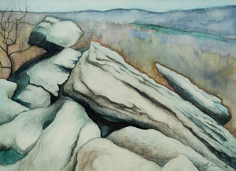 Raised in New England, Ohio and Pennsylvania, he received a BA in Art from Penn State and, then, began his professional career in San Francisco. He returned to the Gettysburg area in 1992 and settled in western Adams County. He has exhibited throughout the U.S. and has received several awards. He’s also a photographer and professional picture framer, living and working in an historic stone farmhouse with his wife, Julie, in the village of Cashtown.